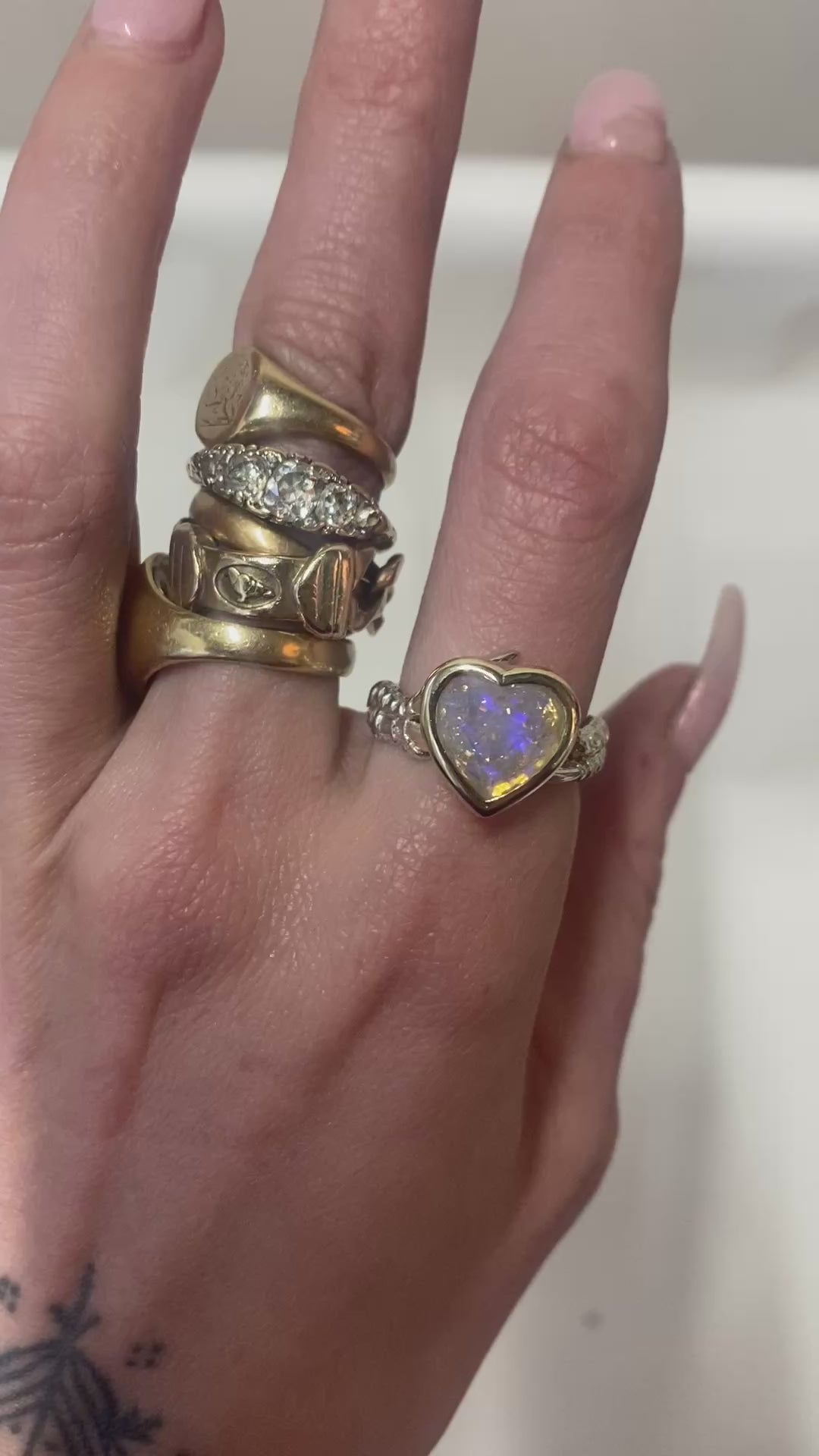 Underneath this magical opal streaked with purple lightning sits a large 1.4ct diamond heart. The opal gives its iridescent colour while the diamond gives it's sparkle and depth. Together the create an impossible stone that shouldn't exist. Set into the underside of the gold frame is little ruby spots, another secret added detail. This ring is my pride and joy, she's taken a very long time to create.